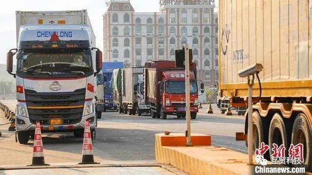 ?在中越邊境的廣西東興邊民互市貿易區內,從越南入境中國、從中國駛向越南的貨車絡繹不絕,現場一派車水馬龍的景象。